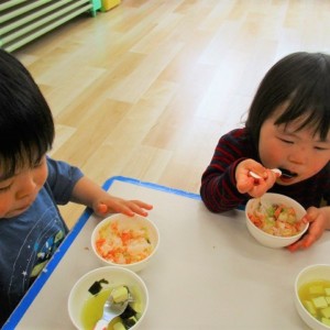 ふじ組さんは先生と一緒に頑張って切りました。